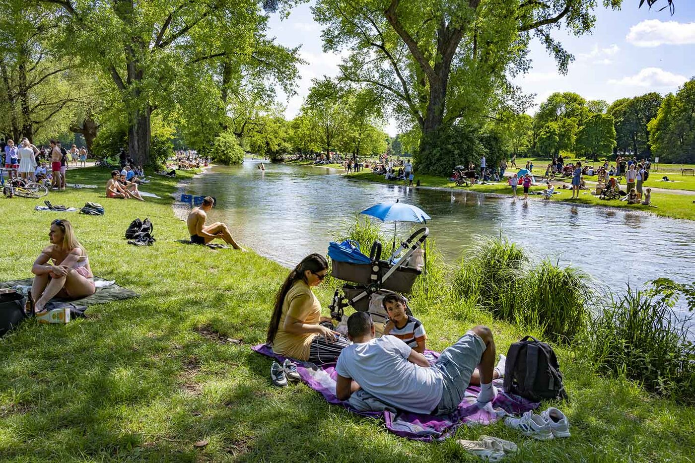 Respectfully Seuratizing a scene in Munich's Englischer Garten similar to Georges Seurat's Seine side paintings.