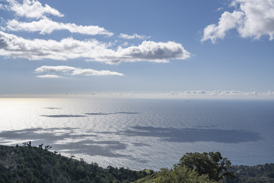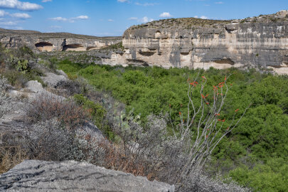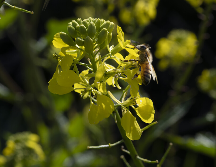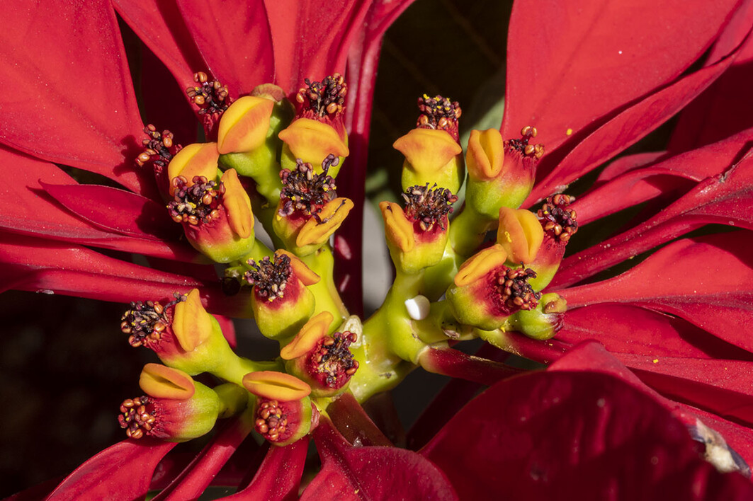 The actual flowers at the center of a poinsetia's crimson leaves.